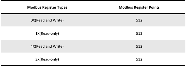 The Modbus gateway supports Modbus RTU/TCP servers. The supported register types and maximum number of points for the server are listed in the table below.