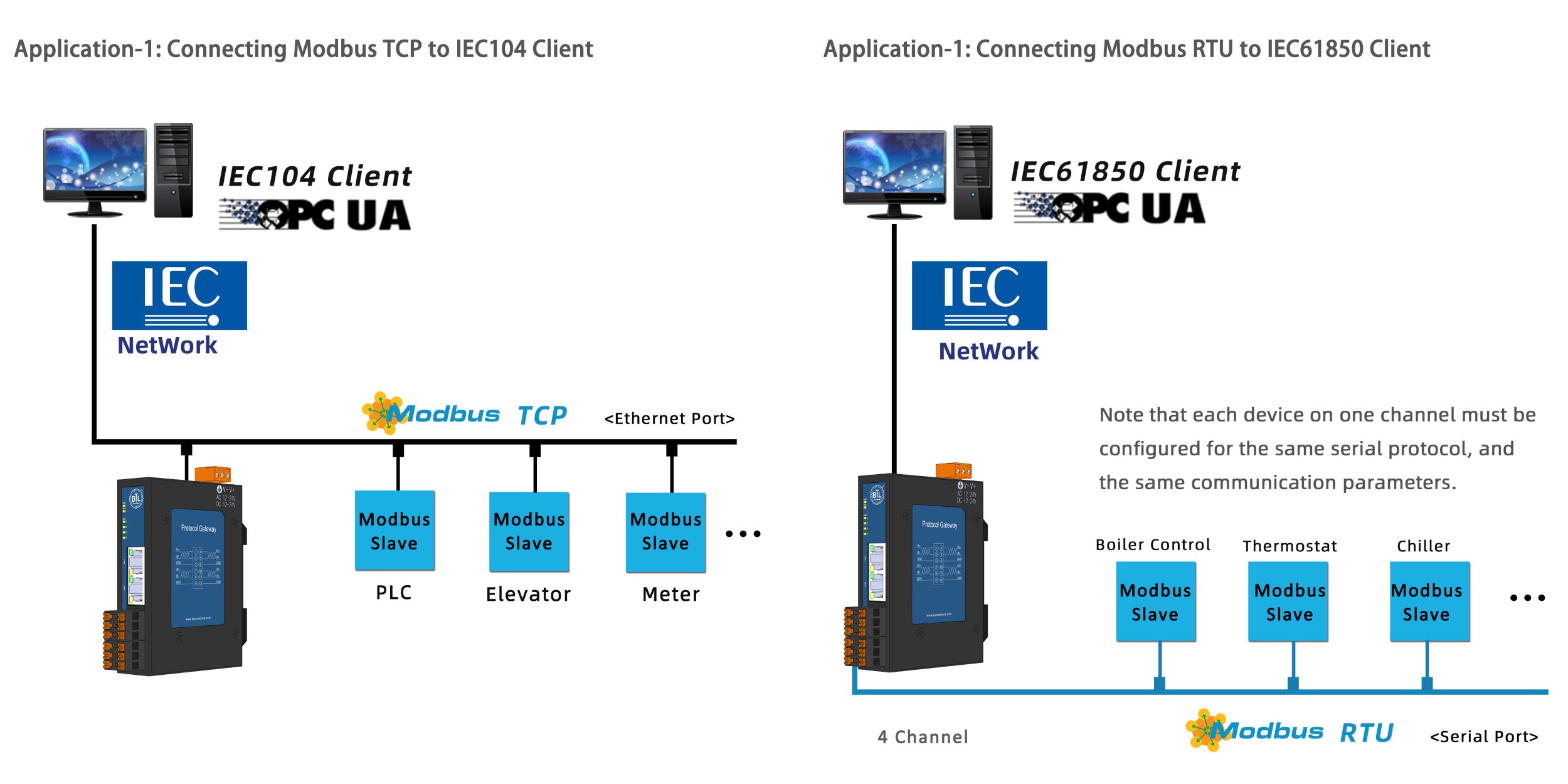 - Support more than 500 protocols to IEC104 server, IEC61850 protocol or OPC UA;
