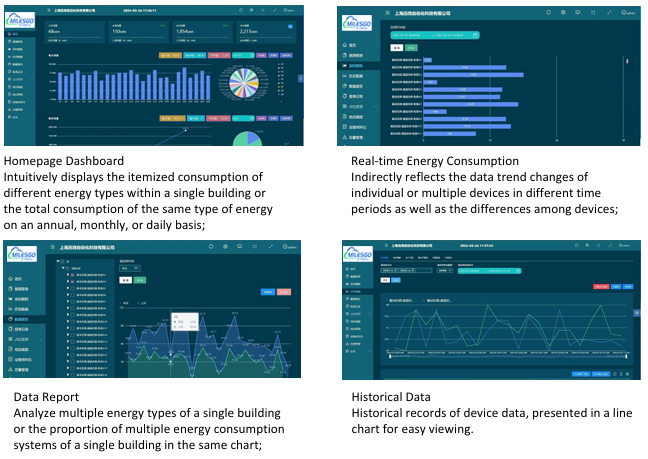 EMS gateway HMI1004-ARM(EMS) can collect, measure, bill, save and classify data such as water, electricity, gas, cold/hot sources, etc., and has peak, off-peak, valley and flat period electricity consumption records. The data is presented intuitively in the form of tables, pie charts and bar charts.