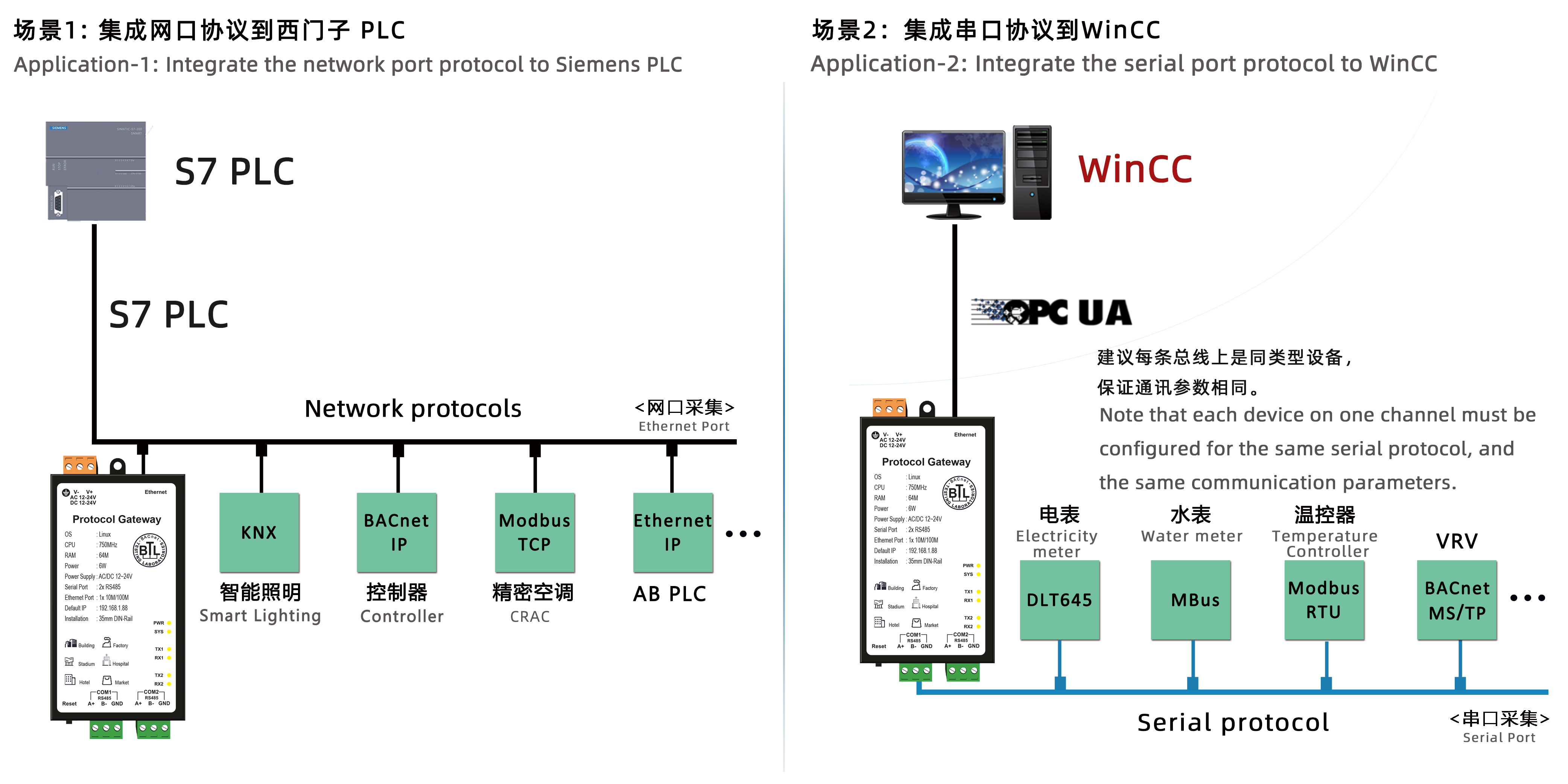 S7 PLC网关相当于一座通信桥梁,将其它非标准通讯协议转成标准西门子PLC S7协议 ,使WinCC上位机、西门子Smart200\1200\1500\300\400等PLC通过硬件网关和不同设备互相通讯,方便系统集成。 运行环境 软件支持Windows XP/2000/2003/Win 7/Win8/Win10/Win Server 2003/Win Server2008/WinVista等多种操作系统。 软件自带WEB支持IE9及以上版本, Opera、苹果的Safari、 Google Chrome、火狐浏览器等。 支持寄存器类型及个数 支持S7协议,该服务器支持的寄存器类型及个数如下表。 注意:网关寄存器个数是动态支持的,每种寄存器最多可建512个点。