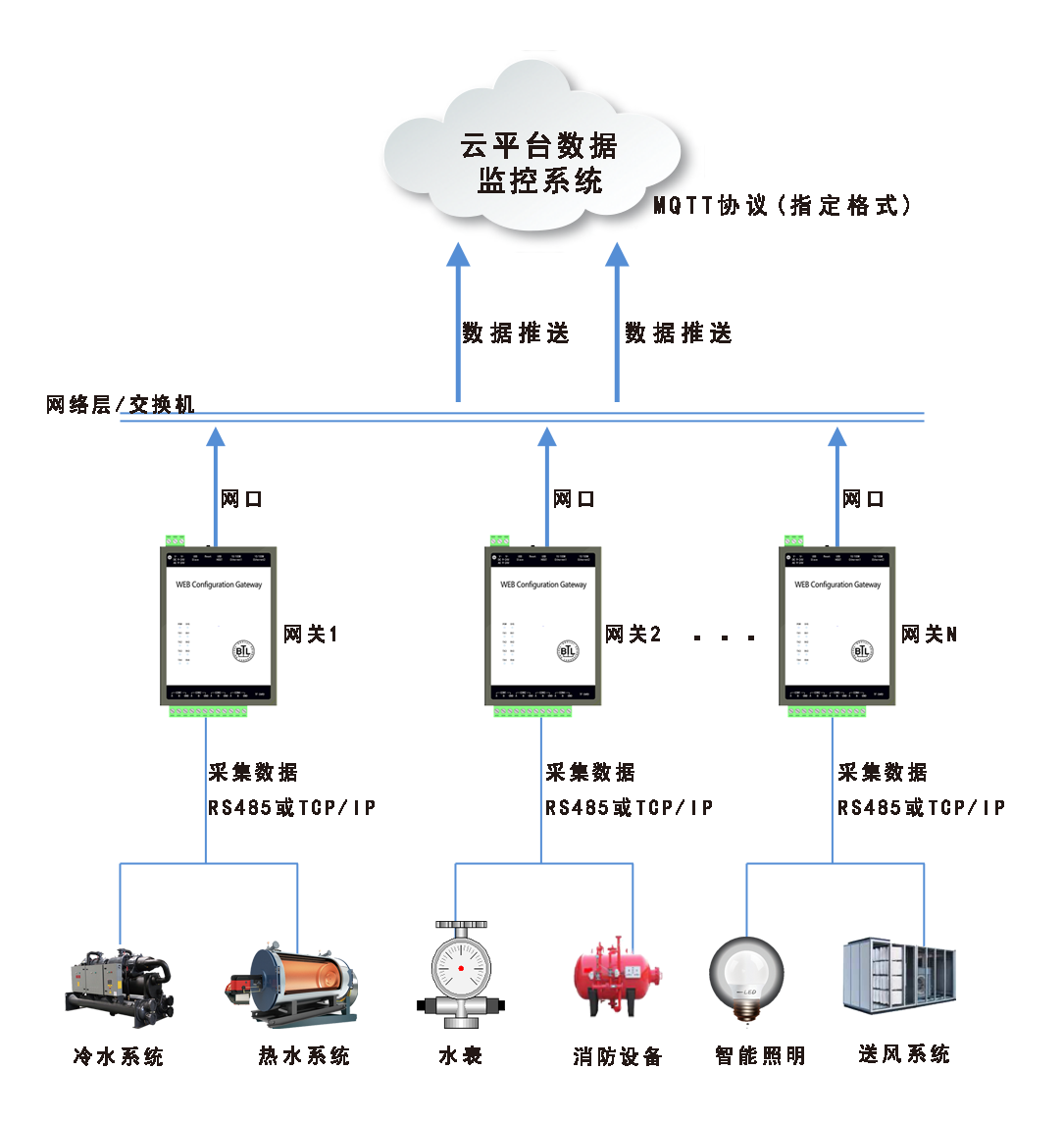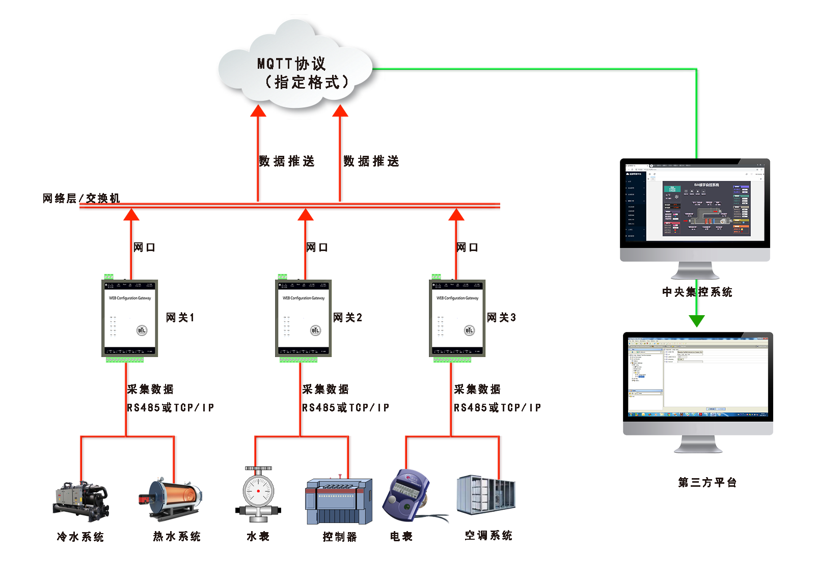 说明:XX项目中,设备分散于各楼层,首先要是用网关将各楼层数据推送到服务器,然后在中控室获取服务器数据并上传组态组态画面,最终是用能源管理软件存储数据到数据系统并进行中央数据监控; 8.1末端设备数据对接