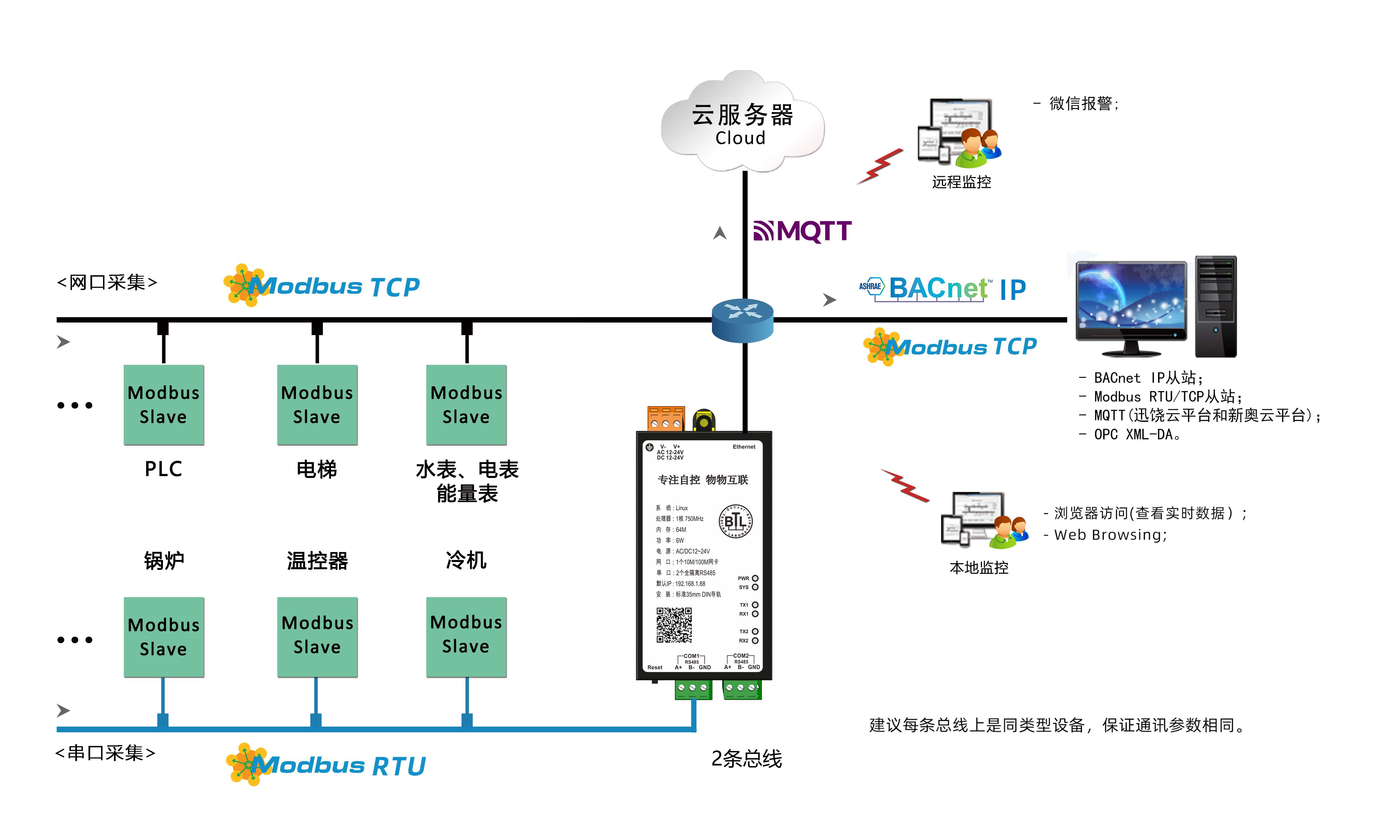 | -支持转发为BACnet IP、Modbus RTU/TCP、MQTT服务器(支持迅饶云平台和新奥云平台); |