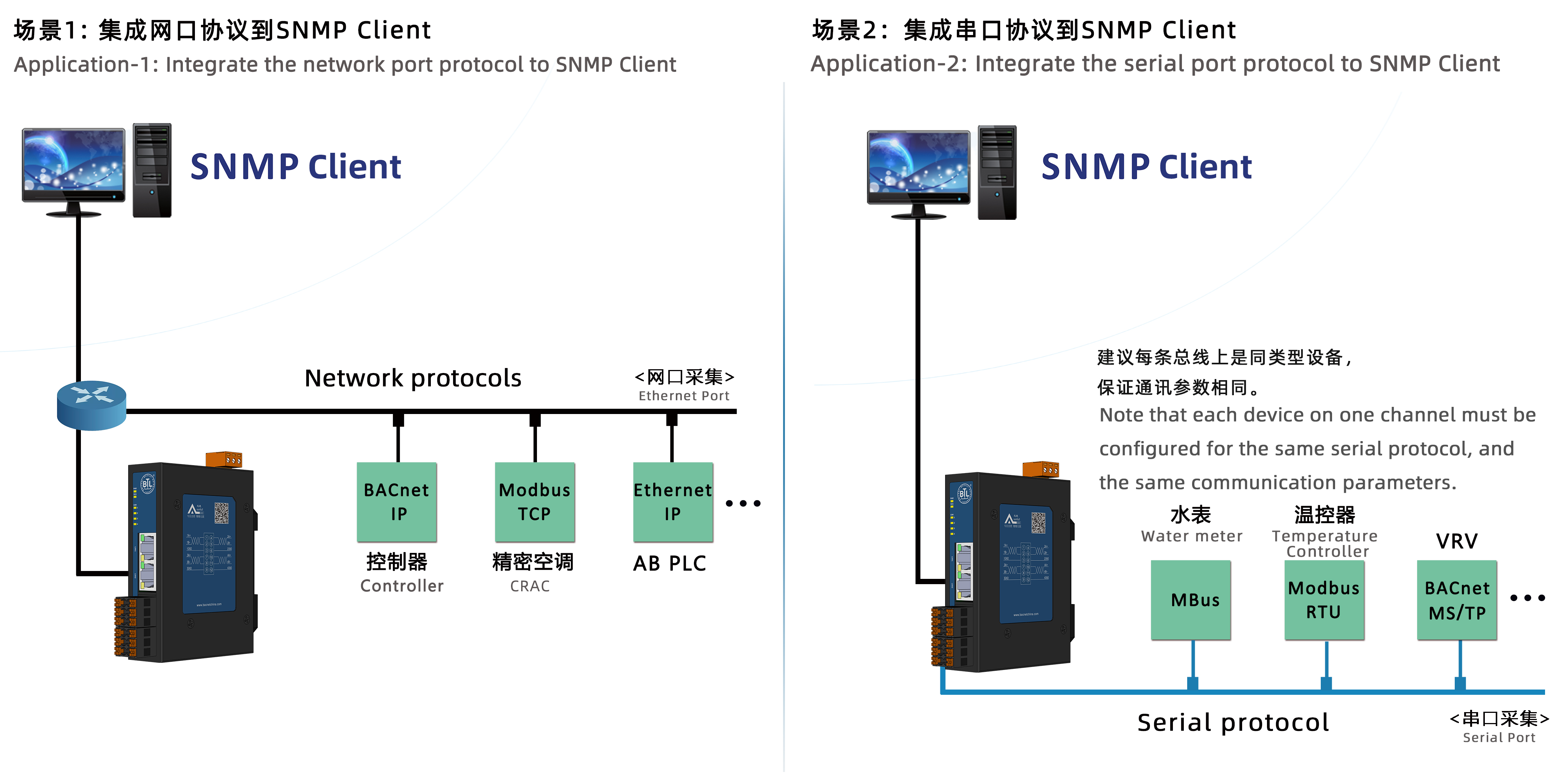 现场的设备连接SNMP硬件网关,网关采集数据向外提供SNMP代理接口,SNMP客户端就可以通过访问SNMP接口对现场设备进行管理监控。