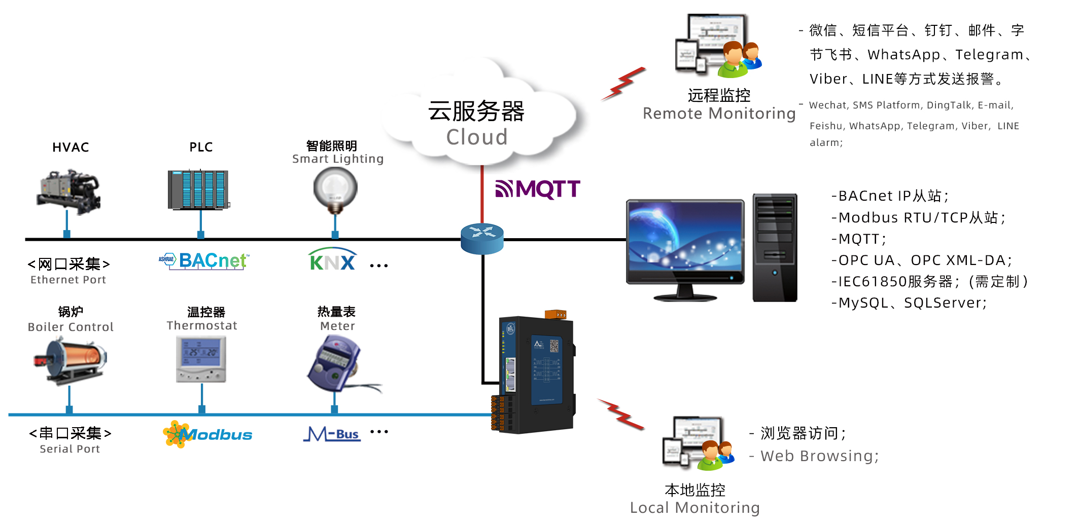 | -支持转为BACnet服务器、Modbus服务器、IEC61850服务器、OPC UA服务器、MQTT服务器; |