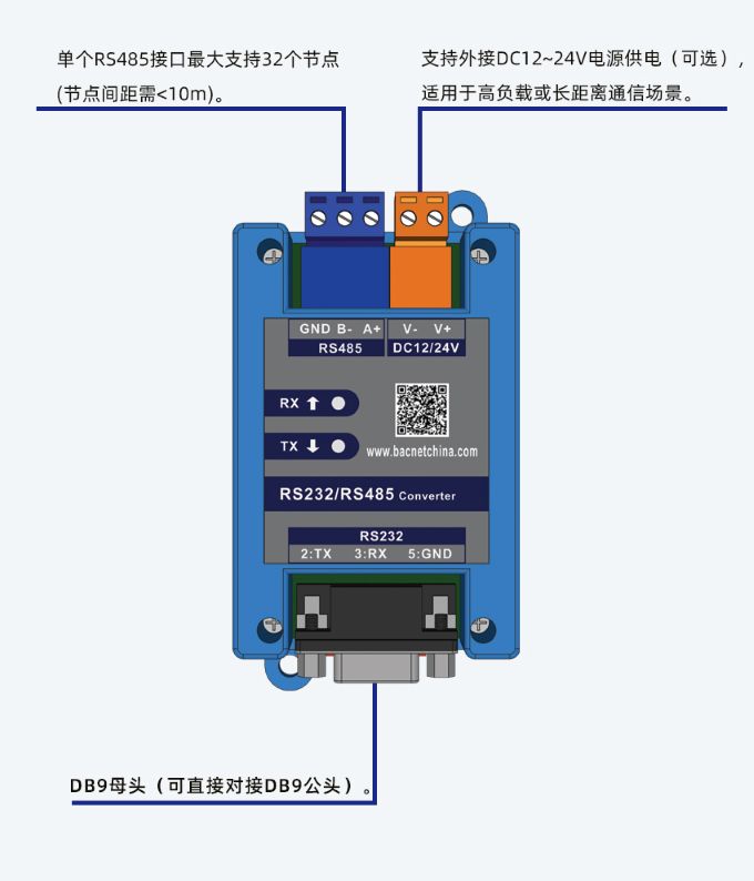 2. 支持外接DC12~24V电源供电(可选),适用于高负载或长距离通信场景;